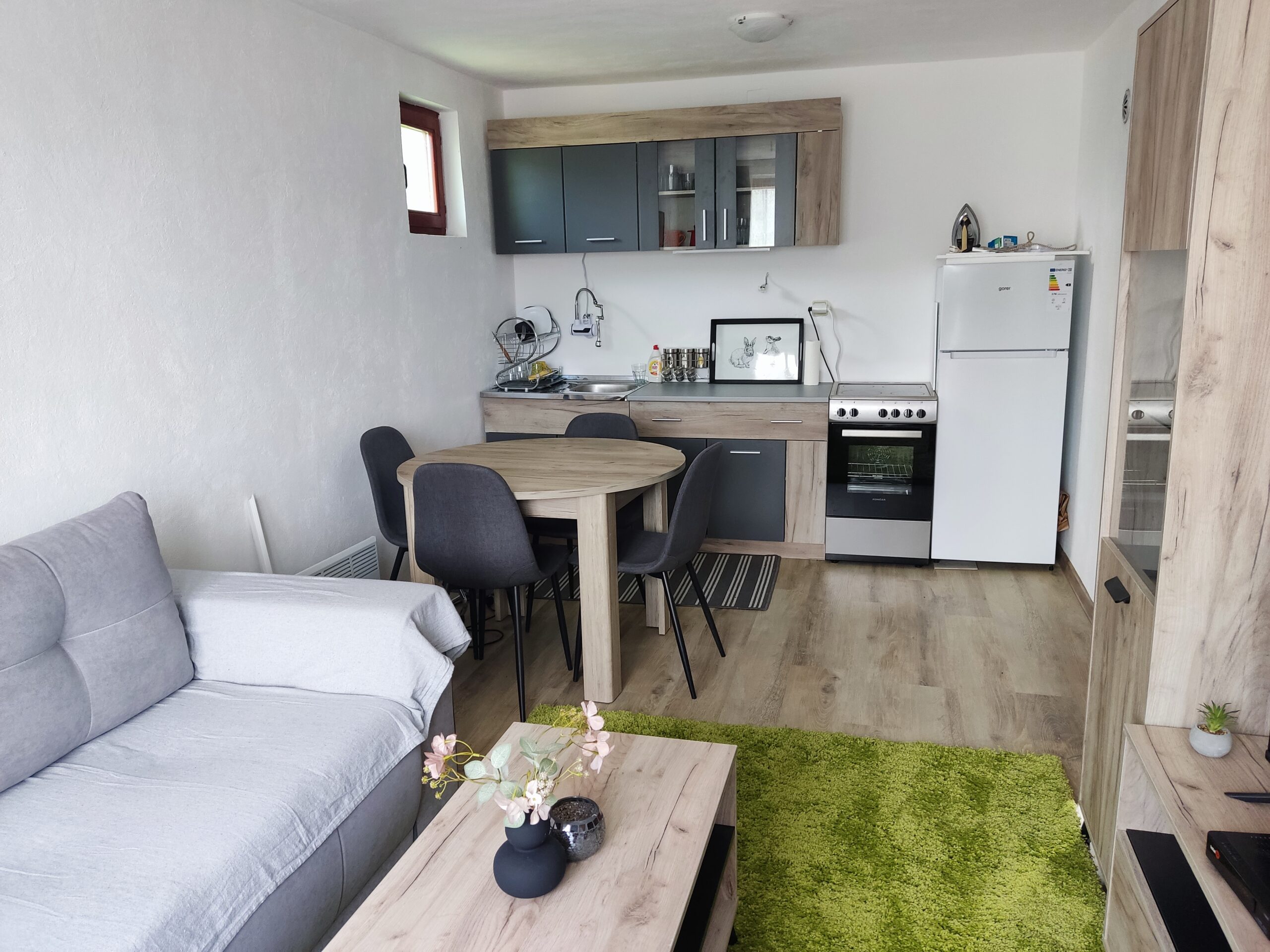 Prizemlje: Dnevni boravak sa kuhinjom i trpezarijom, spavaća soba sa bračnim krevetom, kupatilo.